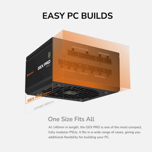 S dĺžkou 140 mm je GEX PRO jedným z najkompaktnejších plne modulárnych zdrojov napájania. To znamená, že sa zmestí do širokej škály skríň a poskytne vám ďalšiu flexibilitu pri stavbe počítača.