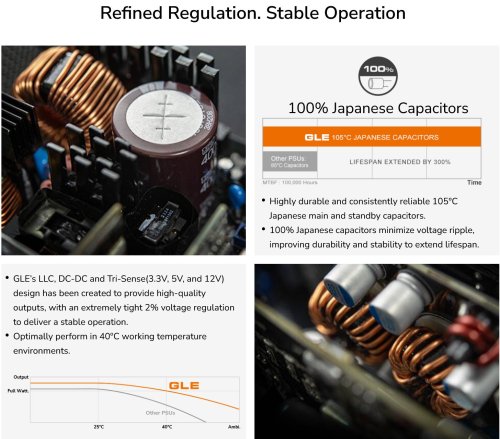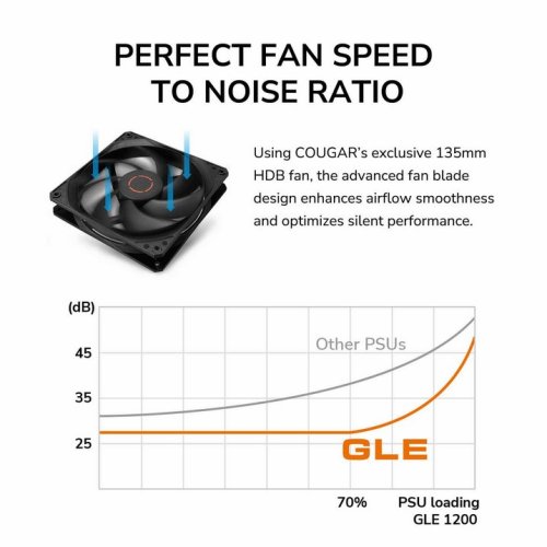 The COUGAR GLE série boasts high-quality 80 PLUS Gold certification, achieving up to 91% conversion efficiency. Utilizing a natívne PCIe 12V-2X6 konektor dizajn, tento výkon supply delivers power k next-gen grafických kariet cez single 12+4-pin kábel, bringing im do kompliance s Intel's ATX 3.1 štandard. With flawless power delivery in 40°C environmentálne, to spotrebuje energiu, redukuje elektrickú spotrebu, a vykonáva stabilný výkon na všetky komponenty.