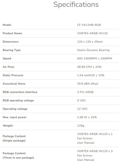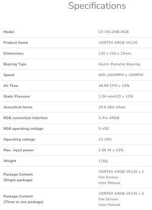 COUGAR VORTEX VK120 high-performance cooling fanúšikov vykonáva rôzne a farebné ARGB bleskové efekty pre váš chassis. Moreover, to improves cooling effect efficiently. It's absolutely an indispensable part of ARGB gaming PC system.