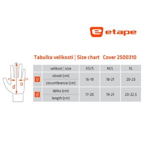Rukavice Etape Cover sú vhodné na šport aj bežné nosenie pre teplotné rozmedzie -10 °C až 10 °C. Tento model v sebe kombinuje ľahké prstové rukavice a teplé palčiaky. Vďaka technológii SmartTouch je možné ovládať displeje mobilných telefónov, tabletov, MP3 prehrávačov, kamier, fotoaparátov alebo navigácií. Rukavice sú vyrobené z kombinácie SoftShell a ThermoFit materiálu. Softshell je elastický materiál odolný vetru a vode. ThermoFit je elastický materiál s výbornými termoizolačnými vlastnosťami. - uvedené veľkosti sú iba orientačné, vhodná veľkosť sa môže líšiť podľa konkrétnej postavy - rukavice 2v1 - prstové ľahké rukavice a teplé palčiaky v jednom výrobku - elastický materiál ThermoFit so zateplením - rukavice - elastický materiál s membránou SoftShell - vrchná vrstva - ovládanie dotykového displeja SmartTouch - protišmykový silikón - protišmykový silikón - protišmykový silikón teplotný rozsah: -10 °C až 10 °C
