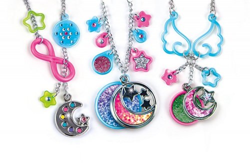 Exkluzívna sada na vytváranie náramkov a náhrdelníkov s fantastickými kúzlami Crazy Stars a Crazy Moon, ktoré svietia v tme! Sada obsahuje: hliníkové náhrdelníky a prstene, prívesky z kovového a farebného plastu v tvare mesiaca a hviezd, holografické nálepky a držiak na doplnky. Zábavná a kreatívna hračka na vytváranie trendových doplnkov! Rozmery balenia: 18 x 18 x 6 cm. Vek: 7+
