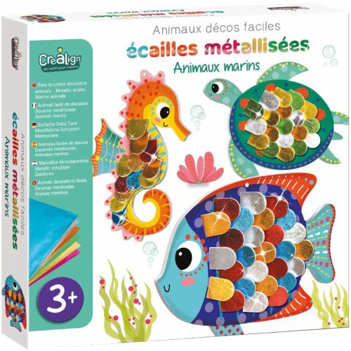 Kreatívna sada pre deti od francúzskej značky Créa Lign z radu Jednoduché obrázky Vhodná pre deti od 3 rokov Obsahuje 3 zvieratká z tvrdého kartónu, 64 šupín na nalepenie a 6 hárkov smetalickými farbami Vďaka nim si deti zvieratká jednoducho dotvoria a vzniknú im originálne 3D