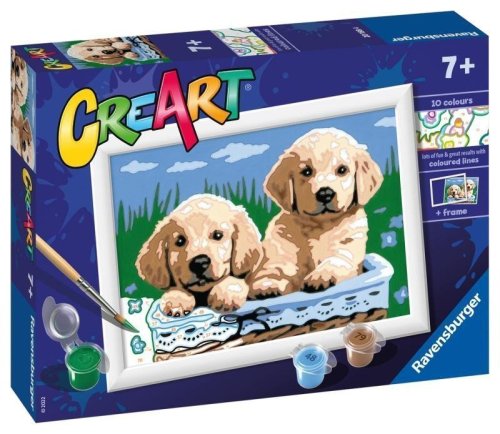 CreArt - to je kreatívna zábava doslova pre každého. Staňte sa na chvíľu profesionálnym maliarom a namaľujte si svoj vlastný obraz. Tieto roztomilé šteniatka rozžiaria každý múr. Postupne vyfarbujte jednotlivé plochy podľa návodu (každé číslo na plátne zodpovedá jednej konkrétnej farbe) a doprajte si radosť z tvorivej práce, pri ktorej sa zabavíte na dlhé hodiny. Maľovanie je skvelá činnosť, ktorá nielen baví, ale aj precvičuje zručnosť, zlepšuje koncentráciu a zaručuje spokojnosť a pocit hrdosti všetkým umelcom. Set obsahuje všetko, čo potrebujete na maľovanie: vysoko kvalitné, pevné plátno s obrazovou predlohou s očíslovanými plochami, sadu akrylových farieb, štetec, kartónový stojan pre tégliky s farbami a rámček. Vykreslené plochy vytvárajú profesionálne vyzerajúce umelecké dielo. Akonáhle obraz dokončíte, nechajte ho zaschnúť a zarámujte ho do rámčeka, ktorý je súčasťou balenia. Maľovanie nikdy nebolo také jednoduché.