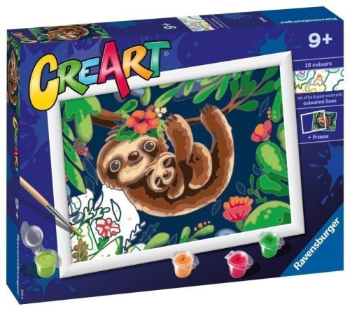 CreArt - to je kreatívna zábava doslova pre každého. Staňte sa na chvíľu profesionálnym maliarom a namaľujte si svoj vlastný obraz. Títo roztomilí leňochodi rozžiaria každý múr. Postupne vyfarbujte jednotlivé plochy podľa návodu (každé číslo na plátne zodpovedá jednej konkrétnej farbe) a doprajte si radosť z tvorivej práce, pri ktorej sa zabavíte na dlhé hodiny. Maľovanie je skvelá činnosť, ktorá nielen baví, ale taktiež precvičuje zručnosť, zlepšuje koncentráciu a zaručuje spokojnosť a pocit hrdosti všetkým umelcom. Set obsahuje všetko, čo potrebujete na maľovanie: vysoko kvalitné, pevné plátno s obrazovou predlohou s očíslovanými plochami, sadu akrylových farieb, štetec, kartónový stojan pre tégliky s farbami a rámček. Vykreslené plochy vytvárajú profesionálne vyzerajúce umelecké dielo. Akonáhle obraz dokončíte, nechajte ho zaschnúť a zarámujte ho do rámčeka, ktorý je súčasťou balenia. Maľovanie nikdy nebolo také jednoduché.