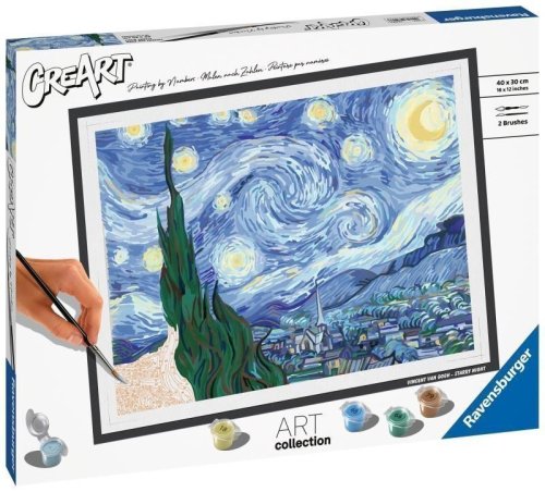 CreArt - to je kreatívna zábava doslova pre každého. Staňte sa na chvíľu profesionálnym maliarom a namaľujte si svoj vlastný obraz. Postupne vyfarbujte jednotlivé plochy podľa návodu (každé číslo na plátne zodpovedá jednej konkrétnej farbe) a doprajte si radosť z tvorivej práce, pri ktorej sa zabavíte na dlhé hodiny. Maľovanie je skvelá činnosť, ktorá nielen baví, ale aj precvičuje zručnosť, zlepšuje koncentráciu a zaručuje spokojnosť a pocit hrdosti všetkým umelcom. Set obsahuje všetko, čo potrebujete na maľovanie: vysoko kvalitný, pevný kartónový podklad s obrazovou predlohou s očíslovanými plochami, sadu akrylových farieb, štetec, kartónový stojan pre kelímky s farbami, rámček. Vykreslené plochy vytvárajú profesionálne vyzerajúce umelecké dielo. Akonáhle obraz dokončíte, nechajte ho zaschnúť a zarámujte ho do rámčeka, ktorý je súčasťou balenia. Maľovanie nikdy nebolo také jednoduché.