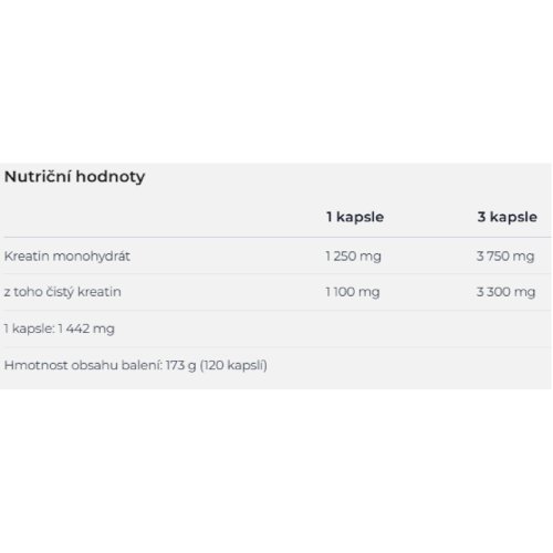 Najúčinnejšia forma kreatínu. Čistý kreatín monohydrát v praktickom balení kapsúl. Pravidelná suplementácia kreatínom zvyšuje silu a svalový výkon pri krátkodobej aktivite s vysokou intenzitou. Svoje miesto si nájde nielen v silových športoch, ale aj v tímových aktivitách ako je napríklad hokej. Bolo vedecky dokázané o kreatíne, že zvyšuje fyzickú výkonnosť v po sebe idúcich dávkach krátkodobého, vysoko intenzívneho cvičenia. Tiež môže zvýšiť účinok tréningu svalovej sily u osôb nad 55 rokov, pri dennom príjme 3 g. Kreatín sa prirodzene vyskytuje napríklad v mäse a rybách. Žiadané nasýtenie bohužiaľ nedosiahneme obyčajnou konzumáciou z bežných potravín. Zloženie: Kreatín monohydrát, želatínová kapsula (želatína, farbivo oxid železa), plnidlo stearan horečnatý, protispekavá látka oxid kremičitý. Odporúčané dávkovanie: Užite maximálne 3 kapsule denne. Pravidelne dávkujte 4 týždne, potom zaraďte 4–6 týždňov pauzu. Je vhodné kombinovať so sacharidmi (napr. spoločne s gainerom). Zapite dostatočným množstvom vody. Neprekračujte odporúčané dávkovanie. Upozornenie: Doplnok stravy. Nenahrádza pestrú stravu. Nie je určené pre deti, tehotné a dojčiace ženy. Ukladajte mimo dosahu detí! Chráňte pred teplom, mrazom a vlhkosťou. Dodávateľ: NUTREND DS ., as ., Chválkovice 604, 779 00 Olomouc, Česká republika