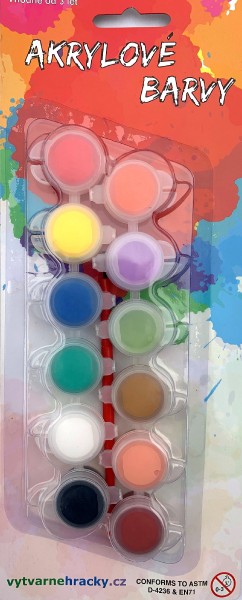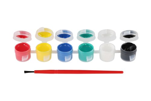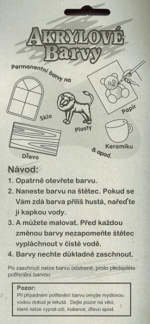 Permanentné farby na sklo, kamene, papier, drevo, keramiku a pod. Opatrne otvorte farbu. Naneste farbu na štetec. Pokiaľ sa Vám zdá farba príliš hustá, narieďte ju kvapkou vody. A môžete maľovať. Pred každou zmenu farby nezabudnite štetec vypláchnuť v čistej vode. Farby nechajte dôkladne zaschnúť. Po zaschnutí nie je možné farbu odstrániť, preto predíďte postriekaniu farbou. Rozmery balenia 11 x 27 x 2 cm. Vhodné pre deti od 3 rokov.