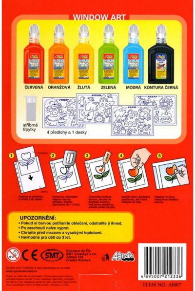 Sada 6 okenných farieb s ktorými si deti vytvoria ozdoby nielen na okná. Vyber si predlohu a vlož ju do dosiek. Pomocou čiernej kontúrovej farby prekresli obrys, vzniknutý obrázok vyfarbi podľa svojej fantázie a dozdôb trblietkami. Obrázok nechaj cca 6 hodín riadne zaschnúť a je hotovo - teraz môžeš vyrobený motív nalepiť napríklad na okno. Vytvárať môžeš aj bez predlohy a svoje obrázky môžeš lepiť na najrôznejšie sklenené alebo plastové povrchy. Balenie obsahuje 6 farebných farieb (červená, oranžová, žltá, zelená, modrá a čierna), fóliu na prekresľovanie, 4 predlohy s najrôznejšími obrázkami a fľaštičku so striebornými trblietkami. Nevhodné pre deti do 3 rokov.