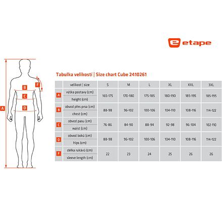 Pánsky cyklistický dres Etape Cube ocení každý cyklista, či už na bicykli jazdí pravidelne alebo rekreačne. Dres s krátkym rukávom je vyrobený z elastického materiálu MicroCool - funkčný elastický materiál z polyesterových mikro vlákien, ktorý veľmi rýchlo schne, odvádza pot a vlhkosť od pokožky. Dres ďalej ponúka dlhý predný zips a 3 zadné vrecká na uloženie drobností. Vďaka použitým reflexným prvkom budete na ceste vždy dobre videný. Veľkostná tabuľka v obrázkoch. Uvedené hodnoty sú iba orientačné a vhodná veľkosť sa môže líšiť podľa konkrétneho typu postavy.