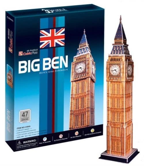 3D puzzle - stavebnica zo série Najslávnejšia architektúra sveta (World's Great Architecture) od CubicFun vyrobená zo špeciálneho materiálu - asi 3mm silnej peny potiahnutej laminovaným potlačeným papierom. Zostavovanie 3D puzzle Cubicfun je zábavou pre celú rodinu. Hotové modely môžu byť zberateľským a dekoratívnym doplnkom bytu alebo detskej izby. Dieliky sa k sebe zostavujú pomocou návodu bez použitia lepidla a nožníc - predražené dieliky iba jednoducho vylomíte z archu. Obtiažnosť 5 , 7 Orientačný čas na zostavenie: 120 - 150 minút Big Ben je hovorové označenie používané na hodinovú vežu ktorá je súčasťou budovy Westminsterského paláca vedľa Temže v Londýne a neformálne pomenovanie Veľkého zvonu. Veža sa týči nad severovýchodnej strane paláca, v ktorom zasadá parlament. Viac na Wikipédii Rozmer zloženého puzzle cca 12 x 12 x 51,5 cm