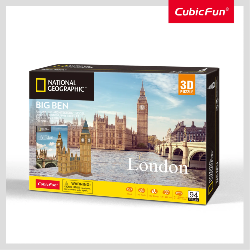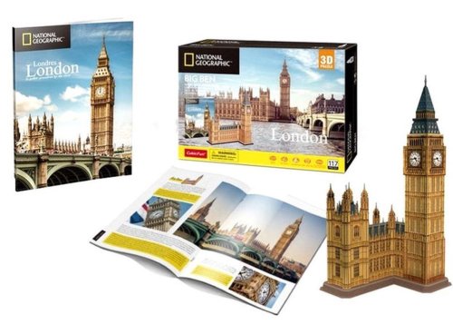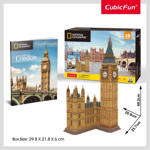 Jedinečný 3D model slávnej dominanty anglického Londýna. 3D puzzle - stavebnica zo série National Geographic od CubicFun vyrobená zo špeciálneho materiálu - asi 3mm hrubej peny potiahnuté laminovaným potlačeným papierom. Súčasťou balenia je cestovný sprievodca po Londýne v angličtine. Zostavovanie 3D puzzle Cubicfun je zábavou pre celú rodinu. Hotové modely môžu byť zberateľským a dekoratívnym doplnkom bytu alebo detskej izby. Dieliky sa k sebe zostavujú pomocou návodu bez použitia lepidla a nožníc - predražené dieliky iba jednoducho vylomíte z archu. Orientačný čas na zostavenie: 120 - 220 minút Big Ben je hovorové označenie používané na hodinovú vežu ktorá je súčasťou budovy Westminsterského paláca vedľa Temže v Londýne a neformálne pomenovanie Veľkého zvonu. Veža sa týči nad severovýchodnej strane paláca, v ktorom zasadá parlament. Viac na Wikipédii Rozmer zloženého puzzle cca 25,7 x 20,9 x 49,2 cm