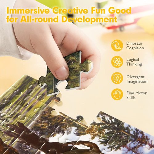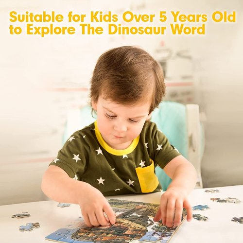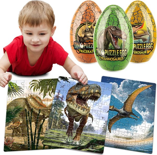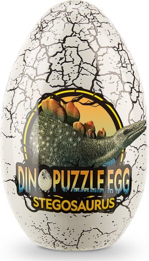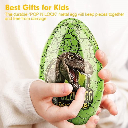 Dvojitá zábava - na jednej strane puzzle ilustrácie dinosaura, na druhej strane abstraktný vzor s dinosaurími fosíliami odolné kovové vajíčko pre bezpečné uloženie puzzle vyrobené z pevného tvrdeného papiera, ktorý sa neroztrhne ani nezlomí potlačené netoxickými atramentmi na sójovej báze perfektný veľkonočný darček narodeninám alebo na Vianoce