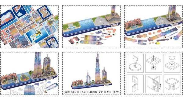 Očarujúce svietiace 3D panorámu Dubaja. 3D puzzle - stavebnica zo série CityLine od CubicFun vyrobená zo špeciálneho materiálu - asi 3mm silnej peny potiahnutej laminovaným potlačeným papierom. Zostavovanie 3D puzzle Cubicfun je zábavou pre celú rodinu. Hotové modely môžu byť zberateľským a dekoratívnym doplnkom bytu alebo detskej izby. Dieliky sa k sebe zostavujú pomocou návodu bez použitia lepidla a nožníc - predražené dieliky iba jednoducho vylomíte z archu. Rozmery zloženého modelu: 53,2 x 15,3 x 48 cm. Orientačný čas na zostavenie: 150 – 180 minút. Rozmer zloženého puzzle cca 53,2 x 15,3 x 48 cm