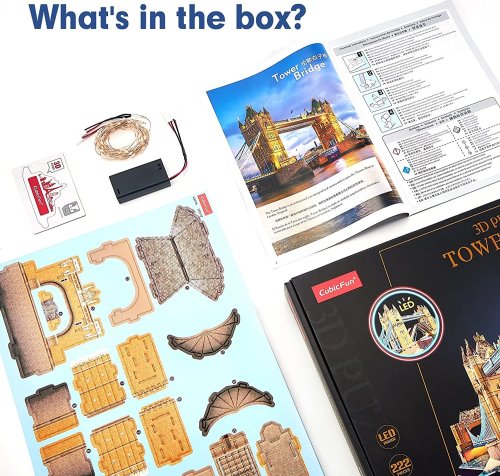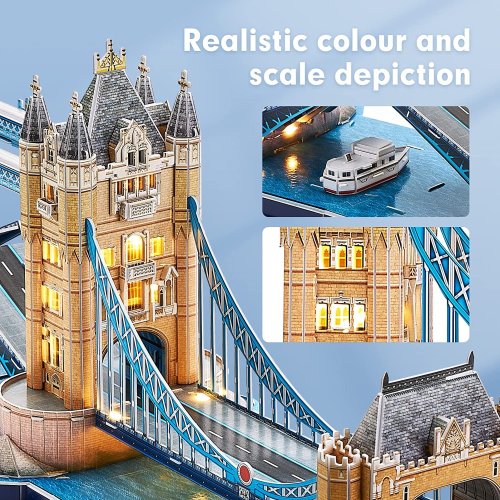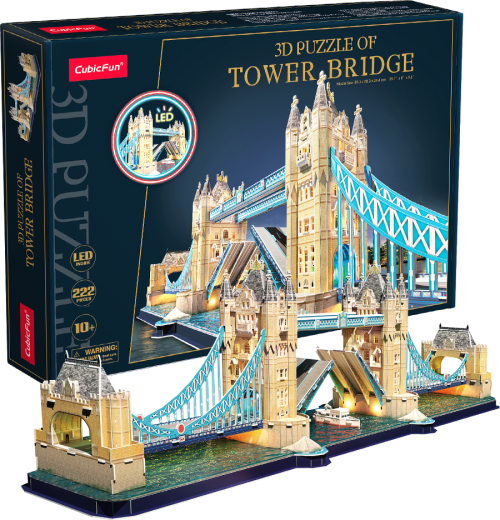 Jedinečný 3D model najslávnejšieho anglického mosta - Tower Bridge, ktorý spája brehy rieky Temže v Londýne. 3D puzzle - stavebnica zo série Architecture Model-LED Lighting (Osvetlená architektúra) od CubicFun vyrobená zo špeciálneho materiálu - asi 3 mm hrubej peny potiahnutej laminovaným potlačeným papierom. Zostavovanie 3D puzzle Cubicfun je zábavou pre celú rodinu. Hotové modely môžu byť zberateľským a dekoratívnym doplnkom bytu alebo detskej izby. Dieliky sa k sebe zostavujú pomocou návodu bez použitia lepidla a nožníc - predražené dieliky iba jednoducho vylomíte z archu. Orientačný čas na zostavenie: 4 hodiny. Obtiažnosť: 6,7 Na prevádzku výrobku je potrebné 2 ks 1,5V batérie AAA (nie sú súčasťou balenia). Rozmer zloženého puzzle cca 89,3 x 20,3 x 24,4 cm