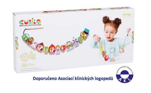 CUBIKA je nová značka drevených hračiek vyrobených iba z ekologicky pestovaného dreva s veľmi precíznym opracovaním a ľúbivým dizajnom. Navliekacia rozprávka je ideálnou hrou na precvičenie jemnej motoriky, trpezlivosti a pamäte. Súprava ponúka 12 drevených navliekacích prvkov s rozprávkovou tematikou, jednu šnúrku s dreveným kolíkom na prestrekovanie na jednej strane a zarážkou na druhej strane a 8 predlôh s rôzne zoradenými tematickými prvkami, podľa ktorých deti jednotlivé dieliky navliekajú. Zdatnejší hráči si potom môžu predlohu len prezrieť a skúsiť navliekať naspamäť a vytvárať si tak svoj vlatný rozprávkový príbeh. Sortiment hračiek značky CUBIKA pomáha deťom rozvíjať predovšetkým senzomotorické schopnosti a zručnosti, logické myslenie, kreativitu, predstavivosť a rôzne poznávacie znalosti. Hračky sú vyrobené z najkvalitnejšieho javora a buku a na farbenie sa používajú tiež vysoko kvalitné farby na vodnej báze, ktoré sú úplne bezpečné pre deti a nemajú žiadny zápach. Všetky výrobky tejto značky majú nemecký certifikát TÜV a sú vyrobené podľa európskej normy pre bezpečnosť hračiek EN 71. Nevhodné pre deti do 3 rokov. Vyrobené v Európe.