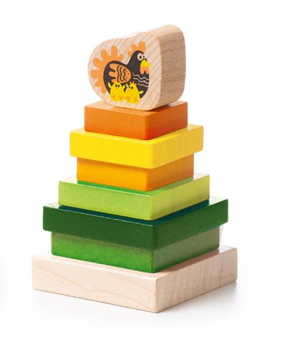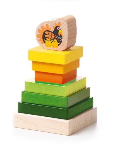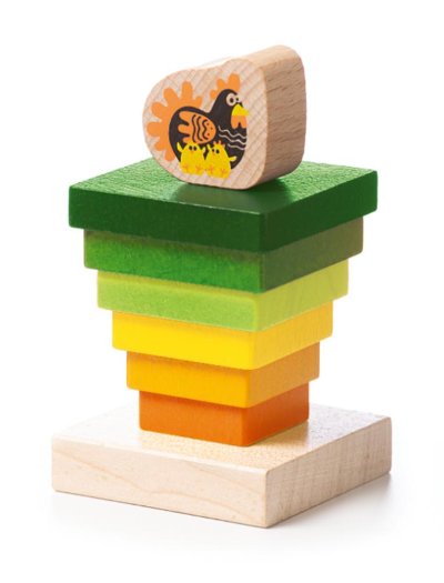 CUBIKA je nová značka drevených hračiek vyrobených iba z ekologicky pestovaného dreva s veľmi precíznym opracovaním a ľúbivým dizajnom. Farebná pyramída so sliepočkou je drevená skladačka s 8 dielmi, ktoré by na seba mali byť poskladané tak, aby bolo možné zachovať pri stavbe správny tvar starodávnej egyptskej pyramídy a zároveň zachovať plynulú postupnosť farieb. Pri jej stavbe sa aj deti naučia čo je to kompatibilita. Sortiment hračiek značky CUBIKA pomáha deťom rozvíjať predovšetkým senzomotorické schopnosti a zručnosti, logické myslenie, kreativitu, predstavivosť a rôzne poznávacie znalosti. Hračky sú vyrobené z najkvalitnejšieho javora a buku a na farbenie sa používajú tiež vysoko kvalitné farby na vodnej báze, ktoré sú úplne bezpečné pre deti a nemajú žiadny zápach. Všetky výrobky tejto značky majú nemecký certifikát TÜV a sú vyrobené podľa európskej normy pre bezpečnosť hračiek EN 71. Nevhodné pre deti do 18 mesiacov. Vyrobené v Európe.