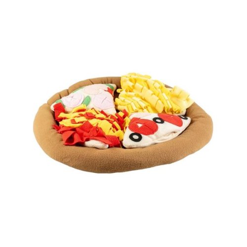 Čuchacia dečka v podobe pizze je skvelé miesto pre schovanie suchého krmiva či maškrty. Interaktívna hračka stimuluje poľovný inštinkt psa alebo mačky, zabaví ich pri hľadaní maškrty a zabraňuje hltaniu potravy, čím pomáha predchádzať problémom s váhou. Spodná strana má protišmykovú úpravu. Rozmery (cca): 50 × 50 × 5 cm Materiál: fleece Farba: hnedá, žltá, červená Údržba: Možno prať v práčke na 30 °C. Upozornenie: Hračka nie je určená deťom. Na použitie iba pod dohľadom. Hračku pravidelne kontrolujte av prípade poškodenia prestaňte používať.
