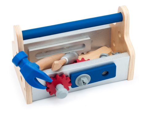 Obsahuje: Obsahuje 14 dielov - kladivko, skrutkovač, pílku, kľúč, dierovanou podložku pre zatĺkanie a skrutkovanie, 2 kusy ozubených koliesok, 2 kusy skrutiek s matičkami, 2 plastové klince, krabičku na uloženie.