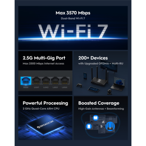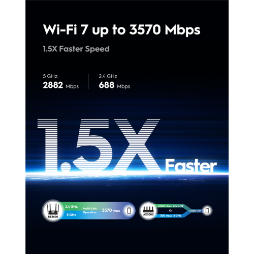 • podpora IEEE 802.11be (Wi-Fi 7) v dvoch pásmach s celkovou prenosovou rýchlosťou až 3570 Mb/s