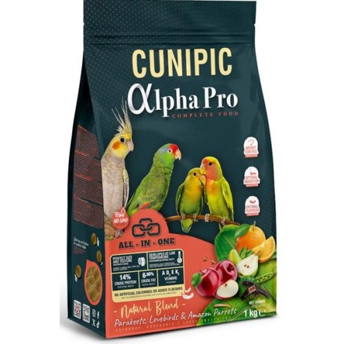 Cunipic Alpha Pro Natural Blend je kompletné a vyvážené prírodné krmivo pre stredne veľké papagáje (napr. amazoňan, agapornis alebo alexander malý). Vďaka koncepcii „All in One“ obsahuje každá granula všetky dôležité živiny, takže papagáj nemôže vyberať len to, čo mu chutí. Nízkoteplotné spracovanie uchováva živiny a zaisťuje krmivu maximálnu výživovú hodnotu. Krmivo podporuje trávenie, vitalitu a zdravie kostí i srdca, neobsahuje pridané cukry ani umelé farbivá a prispieva k dlhému a zdravému životu. Vďaka nízkemu obsahu tuku je vhodné aj pre papagáje s tendenciou k nadváhe. Balenie v ochrannej atmosfére zaisťuje čerstvosť až do posledného sústa. Hlavné prednosti: