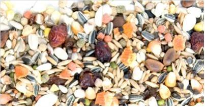 Žíhaná slnečnica, svetlice farbiarska, nelúpaná ryža, pohánka, ovos, kukurica, žlté proso, biela slnečnica, sója mungo, lesklica kanárska, arašidy (so šupkou), jačmeň, nahý ovos, ryža, extrudované , grit z morských mušlí, tekvicové semená, svätojánsky chlieb, hrozienka, hrachové vločky, pufovaná kukurica, žalúdočné kamienky, pomarančová aróma, vitamíny.