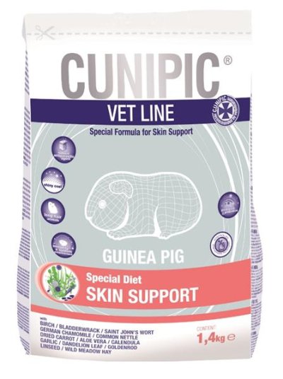 Kompletné vyvážené krmivo Skin support je odporúčané na ochorenie kože a podkožia. Táto zmes liečivých bylín pomáha udržiavať lesklú srsť a zdravú kožu. Zlepšuje metabolické dráhy v tele zvieraťa a zlepšuje odolnosť kože voči vonkajším nepriaznivým faktorom ako je zima, vlhko, horúco... Indikácia: atopická dermatitída, ichtyóza (šupinatosť kože), podpora funkcií kože (dermatitída, straty chlpov), pyoderma (hnisavý zápal kože ), kožné tržné rany, vonkajšie príznaky súvisiace s parazitickými ochoreniami (svrab, blchy, kliešte), pásový opar alebo iné plesňové infekcie kože a podkožia, zápal vonkajšieho ucha, celoživotná starostlivosť pre druhy s dlhou alebo zvláštnou srsťou (napr. angora alebo plemená rex ), pĺznutie srsti. Kontraindikácie: gravidita, dojčenie, hyperlipidémia, zápal pankreasu alebo zápaly prekonané v minulosti. Zloženie: Lúčne seno, pšeničná múčka, lucerna (alfalfa), ľubovník bodkovaný (Hypericum perforatum), jačmeň, slnečnicová múčka, aloe vera (Aloe barbadensis), nechtík lekársky (Calendula officinalis), harmanček ), chaluha bublinatá (Fucus vesiculosus), púpava lekárska list (Taraxacum officinalis), zlatobyľ obyčajný (Solidago virgaurea), cesnak (Allium sativum), žihľava dvojdomá (Urtica dioica), prírodné prebiotiká a probiotiká, lne mrkva (Daucus carota). DOPLNKOVÉ LÁTKY: NUTRIČNÉ DOPLNKOVÉ LÁTKY/kg: Vitamín A 8.000 IU , vitamín D3 1.000 IU , vitamín C 100 mg, vitamín E 25 mg. Omega 3 a omega 6 mastné kyseliny. Analytické zložky: Hrubý proteín 12,1 %, hrubé oleje a tuky 2,4 %, hrubý popol 3,5 %, hrubá vláknina 17,6 %, vlhkosť 11,75 %.