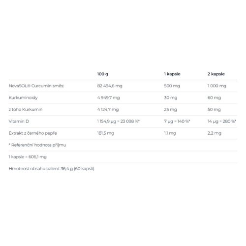 Vynikajúci pomocník pre detox. Unikátna receptúra troch účinných látok predstavuje produkt ideálny do detoxikačných plánov. Výťažok kurkuminoidov má antioxidačné účinky, je protizápalový, podporuje správne trávenie a imunitu. Vďaka unikátnej kombinácii patentovaného extraktu z čierneho korenia a vitamínu D je až 185x vstrebateľnejší ako prírodný kurkumín. Extrakt z kurkumy (kurkumínu) vykazuje významný antioxidačný efekt podľa výsledkov štúdií. Je často používaný pri zápalových stavoch alebo v detoxikačných režimoch. Vitamín D prispieva k optimálnej funkcii imunitného systému a napomáha k správnej činnosti svalov. Telo ho syntetizuje zo slnečného žiarenia. Imunológovia odporúčajú často ho dopĺňať. Bioperin® je jediným produktom z piperínu, ktorý získal patentovaný status pre svoju schopnosť zvyšovať biologickú dostupnosť nutričných látok. Zloženie: NovaSOL® (emulgátor polysorbát 80, extrakt z kurkumy dlhej (6 % kurkuminoidov), cholekalciferol), hydroxypropylmetylcelulózová kapsula, antioxidant kyselina askorbová, extrakt z čierneho korenia (95 % piperínu) – Bioperine®. Odporúčané dávkovanie: Užite 1–2 kapsule s jedlom. Zapite dostatočným množstvom vody. Maximálna denná dávka sú 2 kapsule. Neprekračujte odporúčané dávkovanie. Upozornenie: Doplnok stravy. Nenahrádza pestrú stravu. Nie je určené pre deti, tehotné a dojčiace ženy. Ukladajte mimo dosahu detí! Chráňte pred teplom, mrazom a vlhkosťou. Dodávateľ: NUTREND DS ., as ., Chválkovice 604, 779 00 Olomouc, Česká republika