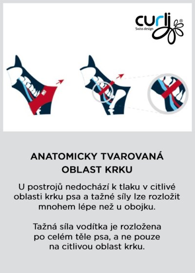• anatomicky tvarovaná oblasť krku - nedochádza k tlaku na citlivú oblasť krku psa a sila tlaku vodítka je tak rozložená na celé telo psa