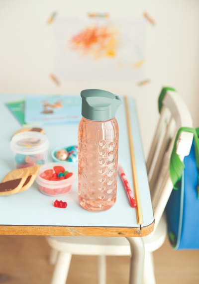 Praktická fľaša odolná voči nárazom a farbeniu. Veko odolné proti netesnosti. V súlade s predpismi o bezpečnosti potravín.