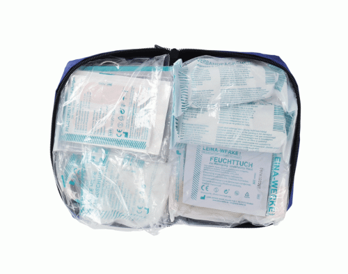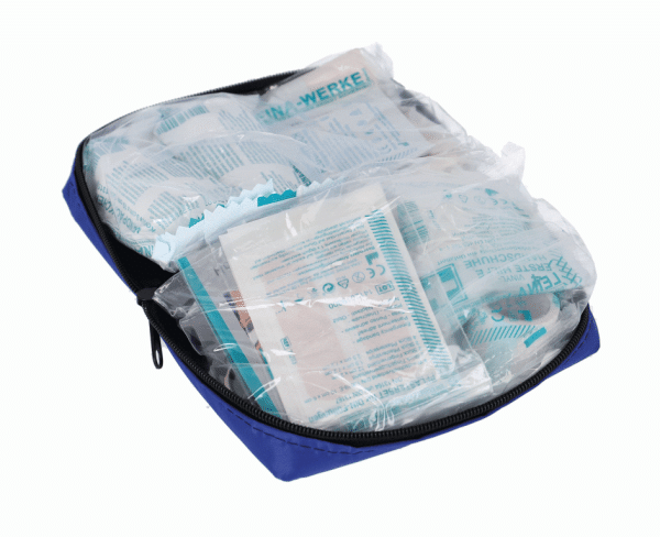 v súlade s DIN 13167 textilná taška: nylon 1x rolka priľnavej náplasti DIN 13019-A, 5 mx 2,5 cm 1x sada 14 náplastí, zahŕňajúca: 4 obväzy DIN 13019-E 10 cm x 6 cm 2 obväzy