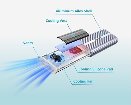 D-Link DSP-411 USB-C 4.0 Enclosure - externý box pre M.2 NVMe SSD Puzdro (box, kryt) D-Link DSP-411 SSD poskytuje profesionálom a tvorcom ultrarýchle prenosné úložisko s kapacitou až 8 TB. Vďaka podpore USB4 ponúka vysokorýchlostný prenos dát rýchlosťou až 40 Gb/s, čo je ideálne na úpravy, zálohovanie a streamovanie v rozlíšení 4K. S odolným hliníkovým dizajnom, tichým chladiacim ventilátorom MagLev a nastavením bez použitia náradia a ďalšieho softvéru je ideálny na cesty naprieč zariadeniami Windows, macOS, Android a Linux, pričom v jednom kompaktnom kryte kombinuje rýchlosť, pohodlie a všestrannosť. Vďaka podpore SSD diskov s kapacitou až 8 TB vám DSP-411 poskytuje dostatok priestoru pre veľké súbory, mediálne knižnice a zálohy, to všetko v elegantnom a prenosnom prevedení, ktoré je navrhnuté pre produktivitu na cestách. DSP-411 je stvorený pre prácu s vysoko výkonnými M Key NVMe PCIe M.2 SSD diskami v rôznych prevedeniach (2230 / 2242 / 2260 / 2280), čo vám dáva slobodu výberu úložiska, ktoré vyhovuje vašim potrebám. Vďaka bezproblémovej kompatibilite so zariadeniami Windows 11/10, macOS, Linux a Android zaisťuje, že vaše dáta budú vždy dostupné, či už upravujete dáta na pracovnej stanici, prenášate súbory na notebooku alebo rozširujete úložisko na cestách. Nie je potrebné inštalovať ovládače – zariadenie je úplne plug and play a nevyžaduje externé napájanie. DSP-411 je vybavený chladiacim plášťom, tichým chladiacim ventilátorom MagLev, silikónovou tepelnou podložkou a puzdrom z hliníkovej zliatiny, ktoré vytvárajú vysoko efektívnu štruktúru na odvod tepla. Ventilátor MagLev zaisťuje vysokorýchlostné prúdenie vzduchu s menším počtom pohyblivých častí, čo zaisťuje trvalý výkon a stabilitu. Udržiavaním vášho SSD disku v chlade aj pri vysokom zaťažení bez rušivého hluku sa môžete sústrediť na bezproblémové vytváranie, prenos a ukladanie súborov, nech už vás práca zavedie kamkoľvek.