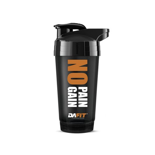 Šejker Dafit NO PAIN NO GAIN s obsahom 700 ml. Čierne alebo biele prevedenie s nápisom NO PAIN NO GAIN. Skrutkovací uzáver zaisťujúci 100% nepriepustnosť. Zacvakávacie malé horné viečko. Celkový obsah 700 ml, stupnica v rozsahu 100-600 ml. Praktické pútko na nosenie alebo pripnutie.