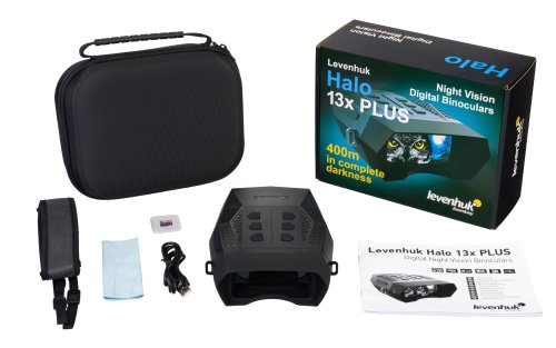 Binokulárny ďalekohľad Levenhuk Halo 13x Plus s infračerveným nočným videním, s digitálnym zoomom a so vstavaným rekordérom predstavuje viacúčelové zariadenie , ktoré príde vhod rybárom, poľovníkom, pracovníkom ostrahy, odvážnym dobrodruhom aj ďalším náročným užívateľom všetkého druhu . , Zatiaľ čo v noci zosilňuje zvyškové svetlo pre jednoduché sledovanie objektov zahalených v tme .