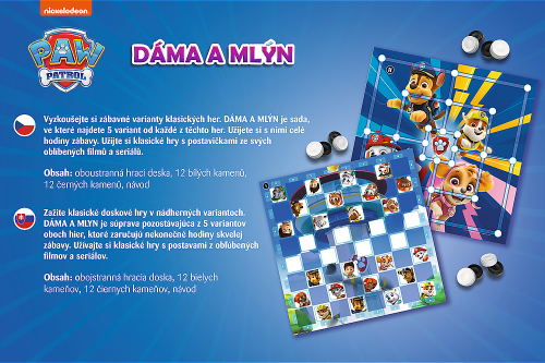 Vyskúšajte si zábavné varianty klasických hier. Dáma a mlyn je sada, v ktorej nájdete 5 variantov od každej z týchto hier. Užijete si s ňou celé hodiny zábavy. Obsah: obojstranná hracia doska, 12 bielych kameňov, 12 čiernych kameňov, návod k hre. Rozmer balenia: 29 × 19 × 4 cm Vhodné pre deti od 6 rokov