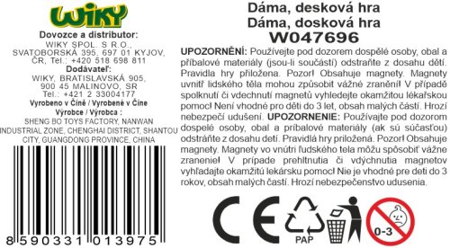 Dáma dosková hra. Rozmery krabičky 20x3x10 cm. Figúrky a hracia doska sú magnetické.