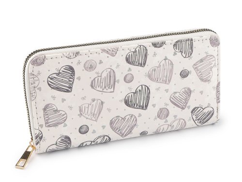 Peňaženka s potlačou srdiečok je elegantným a štýlovým doplnkom. Upúta pozornosť aj vďaka svojmu ligotu, ktorý spôsobujú malé metalické srdiečka a mašličky v potlači. Peňaženka obsahuje jedno hlavné vrecko, ktoré sa zapína na kovový zips. Vnútri je peňaženka členená do troch veľkých priehradiek na papierové bankovky a jedného uzatvárateľného vrecka na zips, vhodné na ukladanie mincí a rôznych drobností. Po vnútorných stranách peňaženky sú priehradky na karty a dve väčšie na doklady, účtenky a pod.