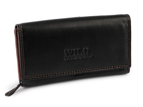 Dámska kožená peňaženka má veľmi kvalitné prevedenie a šikovný dizajn. Je veľmi príjemná na dotyk, disponuje RFID ochranou, ktorá zabráni nežiaducemu skopírovaniu dát z vašej karty. Peňaženka má prednú stranu na klopu na 2 patenty. Po otvorení sa objaví 7 priehradiek na kreditné karty, 1 je priehľadná. Uprostred peňaženky sú 2 dlhé priehradky a veľký rozkladací mincovník rozdelený separáciou na 2 vrecká, ktorý sa uzatvára na zips. Na zadnej strane sa peňaženka uzatvára zápinkou s patentom. Po otvorení sa veľa priehradiek na kreditné karty, 1 je priehľadná a 2 dlhé ploché vrecká.