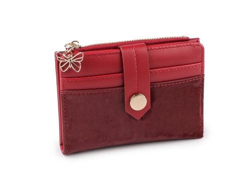 Šikovná malá peňaženka má kompaktný tvar, zmestí sa do každej kabelky. Z časti je potiahnutá elegantnou imitáciou zamatu, ktorý peňaženke pridáva luxusný vzhľad. Predná strana peňaženky sa zapína na zápinku s patentom. Vnútri nájdete 6 priehradiek na kreditné karty, z toho je jedna priehľadná a priehradku na bankovky. Vrecko na mince sa zapína na zips, je ozdobená príveskom kovového motýľa.