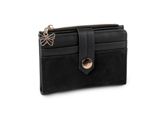 Šikovná malá peňaženka má kompaktný tvar, zmestí sa do každej kabelky. Z časti je potiahnutá elegantnou imitáciou zamatu, ktorý peňaženke pridáva luxusný vzhľad. Predná strana peňaženky sa zapína na zápinku s patentom. Vnútri nájdete 6 priehradiek na kreditné karty, z toho je jedna priehľadná a priehradku na bankovky. Vrecko na mince sa zapína na zips, je ozdobená príveskom kovového motýľa.