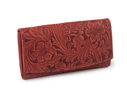 Luxusná dámska peňaženka z pravej kože má veľmi kvalitné prevedenie a šikovný dizajn. Má elegantný povrch s veľkými razenými kvetmi. Peňaženka č.1 - 9] má prednú stranu na klopu s 2 patentmi. Ponúkne svojej majiteľke veľké množstvo vreciek a priehradok. Okrem veľkého úložného priestoru na bankovky, má aj uzatvárateľné vrecko na mince, vrecko na doklady, miesto na uloženie 10 platobných alebo vernostných kariet a mnoho ďalších vreciek na vaše použitie. Peňaženky č.10 – 18 sú dlhé 17 cm. Klopu na patent majú z prednej aj zadnej strany. Ponúknu svojej majiteľke veľké množstvo vreciek a priehradok. Okrem veľkého úložného priestoru na bankovky, majú aj uzatvárateľné vrecko na mince, vrecko na doklady, miesto na uloženie 21 platobných alebo vernostných kariet a mnoho ďalších vreciek. Upozorňujeme zákazníkov, že odtiene peňaženiek sa môžu mierne líšiť. [Niektoré peňaženky môžu mať zips zo zadnej strany alebo môžu mať zapínanie na pracku.]