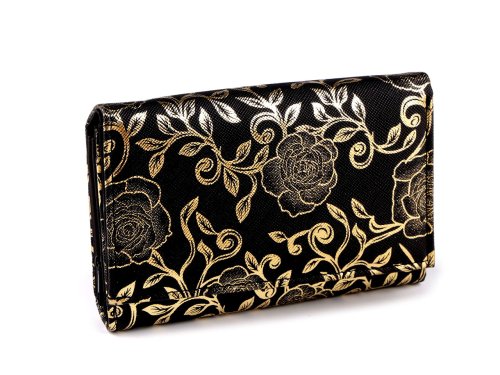 Dámska peňaženka s metalickými ružami nadchne nielen svojim dizajnom, ale aj svojim vnútorným usporiadaním s množstvom priehradiek a vreciek. Zatvára sa na klopu a patent. Vnútri sú 2 oddelené priestory. Po pravej strane sú 4 priehradky na karty, z toho je 1 priehľadná. Pod nimi je 1 veľké ploché vrecko. Uprostred peňaženky sa nachádzajú 2 vrecká na bankovky, v jednom je malé vrecko na zips. Vľavo je mincovník, ktorý sa zapína na zips. Peňaženka ukrýva ešte druhý oddiel, ktorý sa objaví po odopnutí zápinky na ľavej strane. Tu sa nachádza 6 priehradiek na kreditné karty a 5 plochých vreciek.