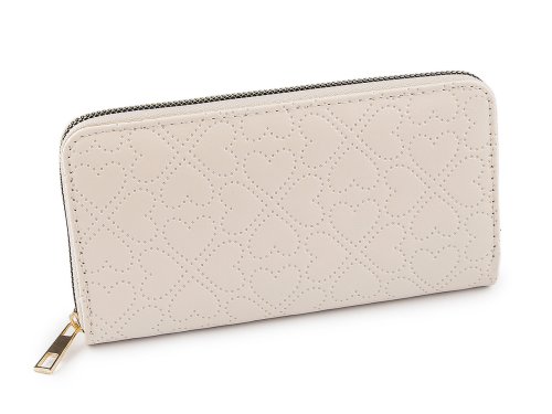 Dámska peňaženka s motívom srdiečok je elegantným a štýlovým doplnkom, ktorý upúta pozornosť. Peňaženka obsahuje jedno hlavné vrecko, ktoré sa zapína na kovový zips. Vnútri je peňaženka členená do troch veľkých priehradiek na papierové bankovky a jedného uzatvárateľného vrecka na zips, vhodné na ukladanie mincí a rôznych drobností. Po vnútorných stranách peňaženky sú priehradky na karty a dve väčšie na doklady, účtenky a pod.