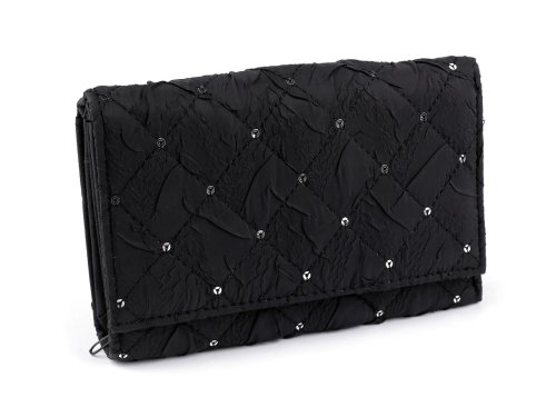 Dámska prešívaná peňaženka s flitrami má veľmi pútavý dizajn. Textilný poťah je príjemný na dotyk. Nadchne vás svojim vnútorným usporiadaním s množstvom priehradiek a vreciek. Zatvára sa na klopu a patent. Vnútri sú 2 oddelené priestory. Po pravej strane sú 4 priehradky na karty, z toho je 1 priehľadná. Pod nimi je 1 veľké ploché vrecko. Uprostred peňaženky sa nachádzajú 2 vrecká na bankovky, v jednom je malé vrecko na zips. Vľavo je mincovník, ktorý sa zapína na zips. Peňaženka ukrýva ešte druhý oddiel, ktorý sa objaví po odopnutí zápinky na ľavej strane. Tu sa nachádza 6 priehradiek na kreditné karty a 5 plochých vreciek.
