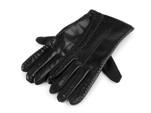 Elegantné dámske rukavice sú na hornej strane ozdobené lesklou prešívanou eko kožou. Rukavice sú jemne pružné. Dolná strana rukavíc pripomína brúsenú kožu. Vnútri majú jemný plyš, ktorý je veľmi príjemný na dotyk. Hodí sa do miernej zimy alebo do chladnejšieho jesenného počasia. Na ukazováku pravej aj ľavej ruky je vyšitý kvet, vďaka ktorému môžete ovládať dotykové prístroje - mobil, tablet, bankomat a pod. Šírka je meraná na voľne položených rukaviciach uprostred (bez palca).