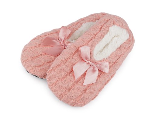 Dámske balerínky sú skvelé ako domáca obuv. [Z vrchnej strany je pletenina s vrkočovým vzorom, vo vnútri je teplá chlpatá podšívka, ktorá verne imituje vlnu.] Protišmykové gumové bodky na chodidle zabránia pošmyknutiu. Upozorňujeme zákazníkov, že zloženie na štítkoch sa môže líšiť, materiál je akryl, polyamid a polyester.