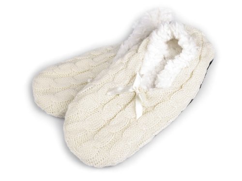 Dámske balerínky sú skvelé ako domáca obuv. [Z vrchnej strany je pletenina s vrkočovým vzorom, vo vnútri je teplá chlpatá podšívka, ktorá verne imituje vlnu.] Protišmykové gumové bodky na chodidle zabránia pošmyknutiu. Upozorňujeme zákazníkov, že zloženie na štítkoch sa môže líšiť, materiál je akryl, polyamid a polyester.