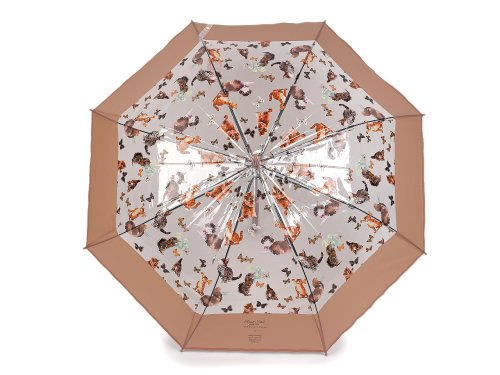 Priehľadný dáždnik s farebnou potlačou mačiek s motýľmi je ideálnou voľbou pre všetky milovníčky hravých módnych doplnkov. Je vystreľovacia, okraj má ozdobený širokým farebným lemom. Konštrukcia dáždnika je z kovového drôtu a pružných lamiel, tvorí osem polí. Vďaka nim je veľmi pevný, neohne sa ani za najväčšieho nečasu. Klasická tyč je zakončená pevnou rukoväťou. Hĺbka dáždnika je 25 cm.
