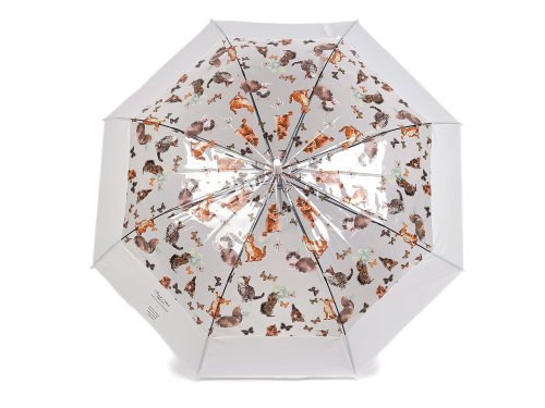 Priehľadný dáždnik s farebnou potlačou mačiek s motýľmi je ideálnou voľbou pre všetky milovníčky hravých módnych doplnkov. Je vystreľovacia, okraj má ozdobený širokým farebným lemom. Konštrukcia dáždnika je z kovového drôtu a pružných lamiel, tvorí osem polí. Vďaka nim je veľmi pevný, neohne sa ani za najväčšieho nečasu. Klasická tyč je zakončená pevnou rukoväťou. Hĺbka dáždnika je 25 cm.