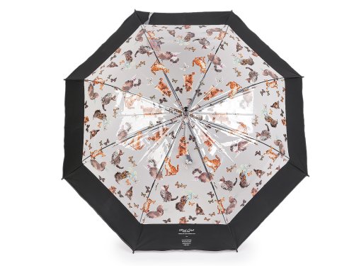 Priehľadný dáždnik s farebnou potlačou mačiek s motýľmi je ideálnou voľbou pre všetky milovníčky hravých módnych doplnkov. Je vystreľovacia, okraj má ozdobený širokým farebným lemom. Konštrukcia dáždnika je z kovového drôtu a pružných lamiel, tvorí osem polí. Vďaka nim je veľmi pevný, neohne sa ani za najväčšieho nečasu. Klasická tyč je zakončená pevnou rukoväťou. Hĺbka dáždnika je 25 cm.