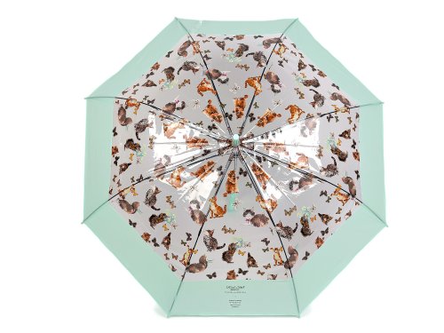 Priehľadný dáždnik s farebnou potlačou mačiek s motýľmi je ideálnou voľbou pre všetky milovníčky hravých módnych doplnkov. Je vystreľovacia, okraj má ozdobený širokým farebným lemom. Konštrukcia dáždnika je z kovového drôtu a pružných lamiel, tvorí osem polí. Vďaka nim je veľmi pevný, neohne sa ani za najväčšieho nečasu. Klasická tyč je zakončená pevnou rukoväťou. Hĺbka dáždnika je 25 cm.